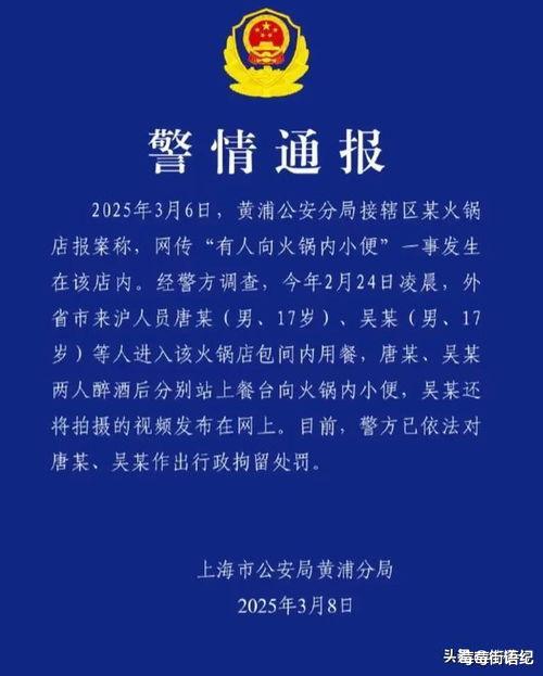 事情要追溯到今年2月24日凌晨。在上海一家海底捞的包间内,唐某和吴某用餐后竟先后站上餐桌,向火锅内小便,还互相拍摄视频“留念”。更离谱的是,几天后,吴某竟然把视频发到了朋友圈。内容迅速发酵,在各大平台疯狂传播,“海底捞·小便门”一时间成为全网热议焦点。