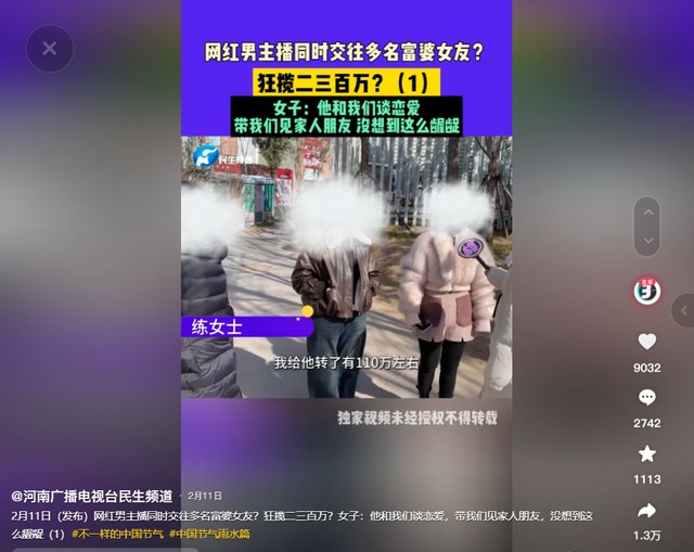 而在恋爱被骗这上面,可不是只有男士被女人骗的,这不,在今年二月份的时候,还有一节目报道了多名女性和同一位男主播恋爱故事,这又是怎么回事呢?