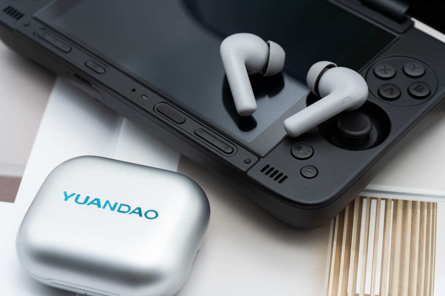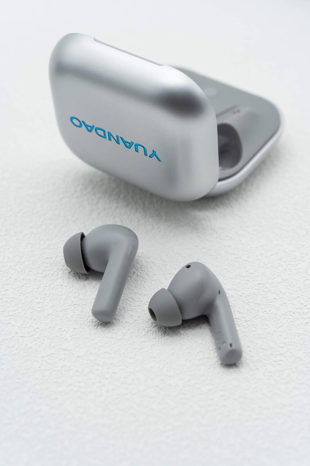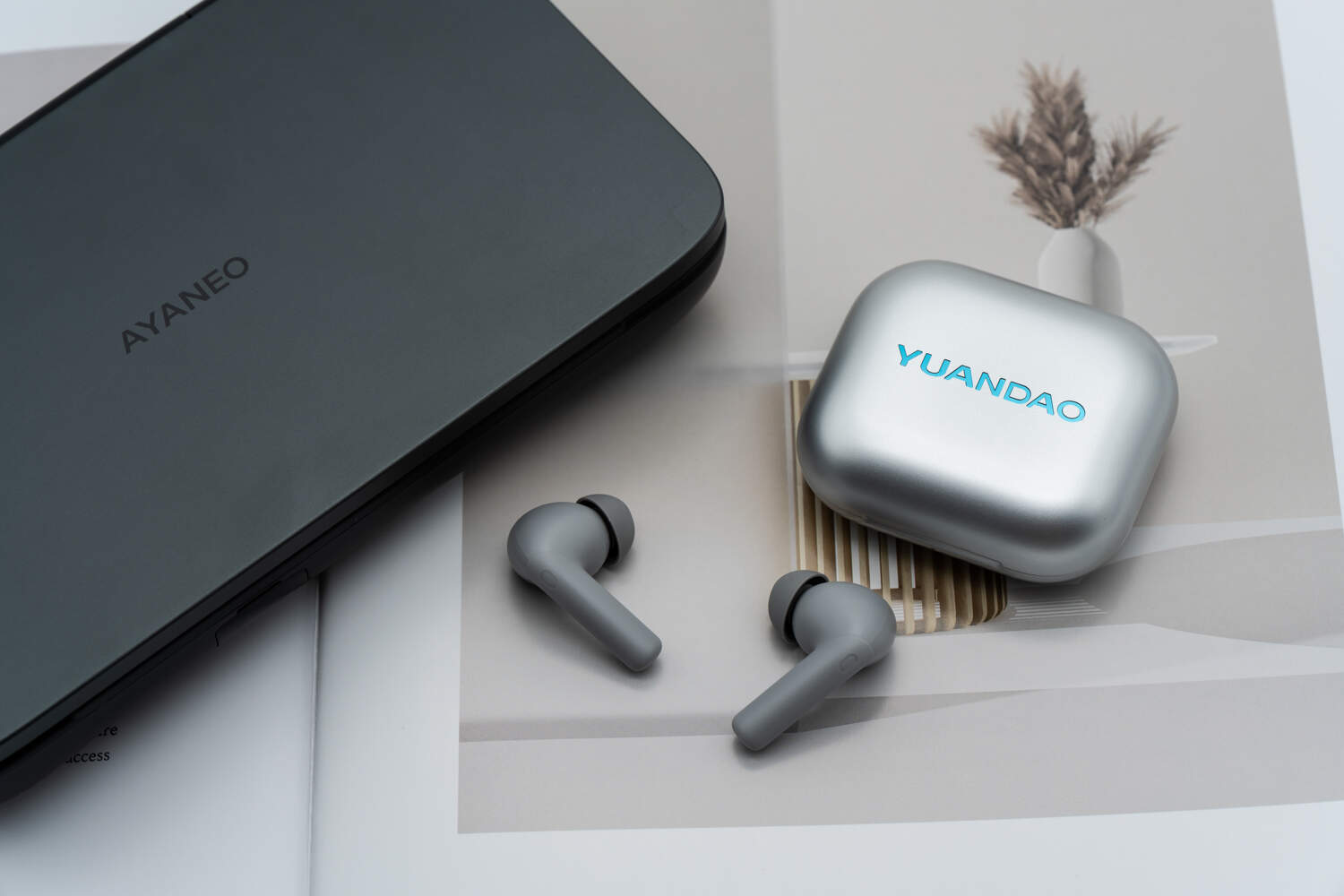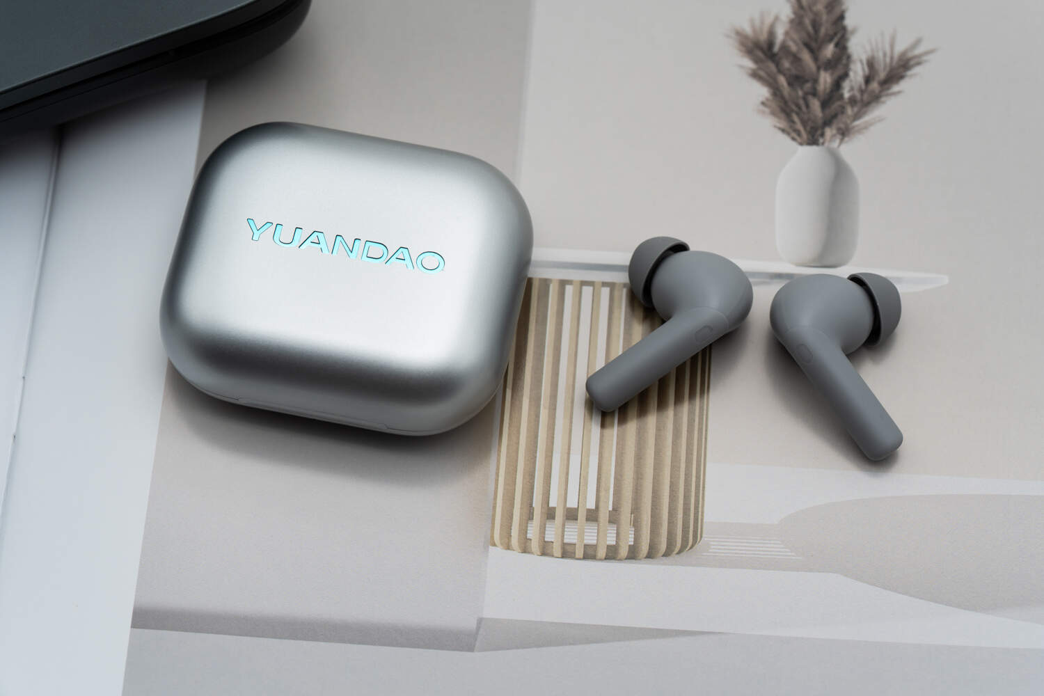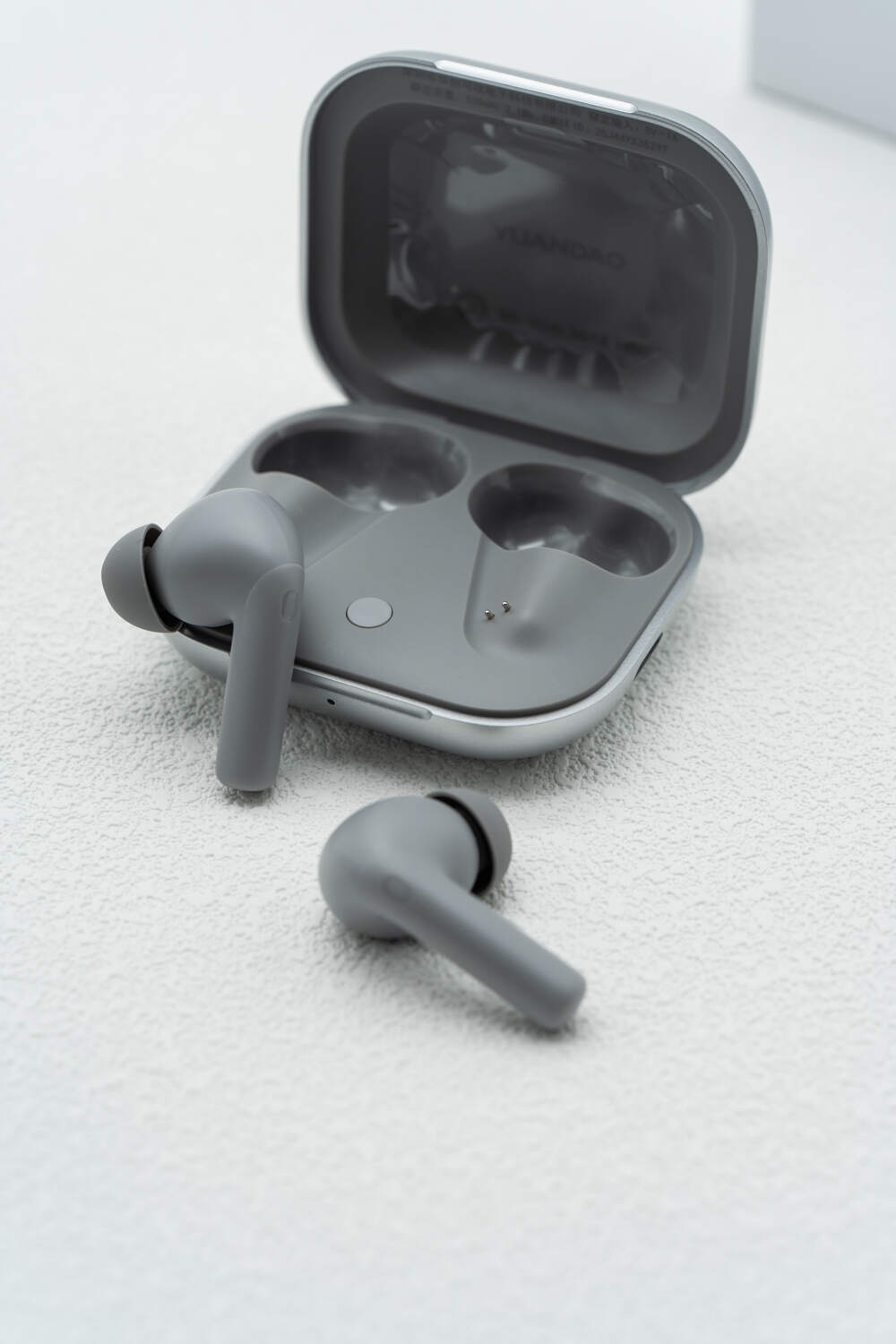 原点的外观设计确实是有点儿那种,仿佛刻意避开了大多数能吸引眼球的元素,除了充电舱盖上的泛着蓝光的“YUANDAO”logo之外,不管是灰色还是蓝色都从设计上透着七分低调,两个配色的色彩饱和度也很低,低到接近“北欧风”的家装色调了。而造型上原点的耳塞整体非常圆润,典型的柄式TWS造型。而充电盒开启后,原点采用的是近似“躺平”式的收纳方式,主要通过关键位置的磁吸来固定,暴露部分较多,也就较为方便拿取。这个设计深得我心。