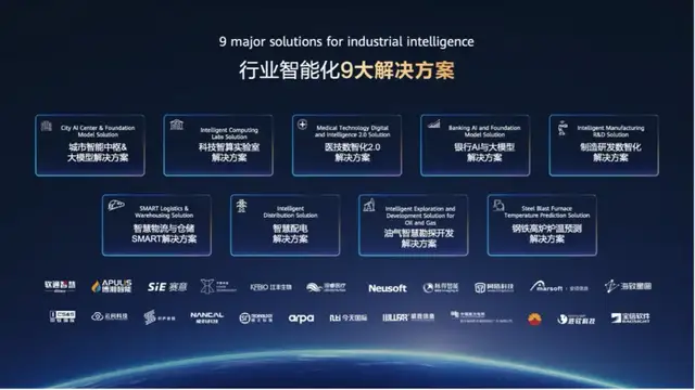 第三,推出可规模复制的行业解决方案。华为携手合作伙伴发布九大行业智能化解决方案,包括:城市智能中枢与大模型、科技智算实验室、医技数字化2.0、银行AI与大模型、制造研发数智化、智慧物流与仓储SMART、智慧配电、油气智慧勘探开发、钢铁高炉炉温预测等。