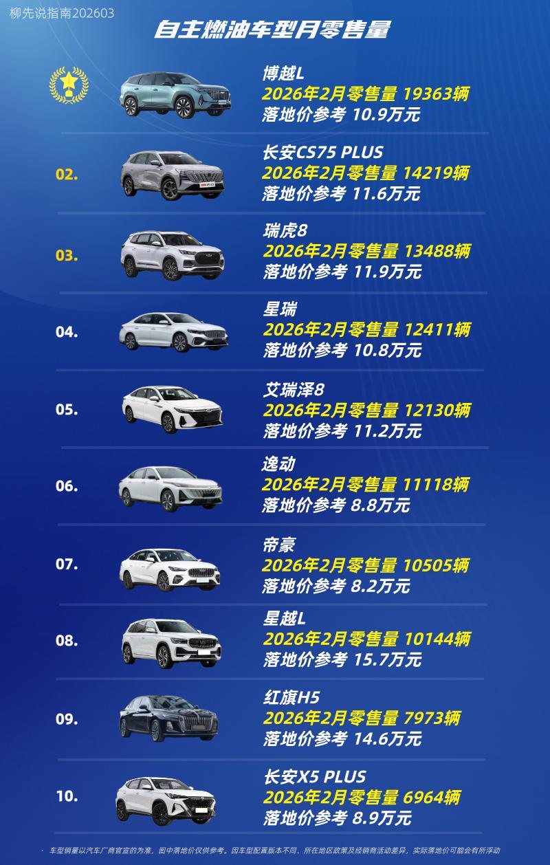 根据2026年2月的市场数据显示,自主燃油车型销量前五名分别为:博越L、长安CS75 PLUS、瑞虎8、星瑞以及艾瑞泽8。这份榜单不仅反映了消费者的真实选择,也彰显了自主品牌在燃油车市场的强大竞争力。