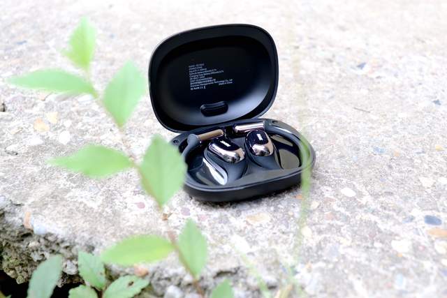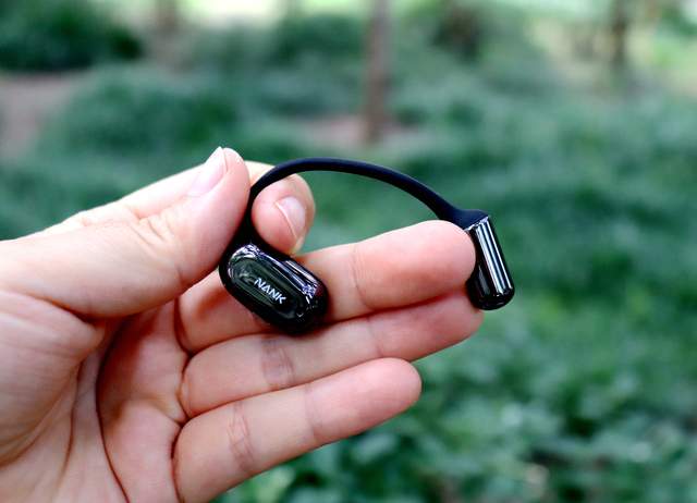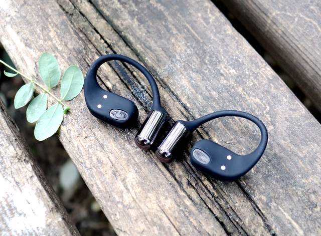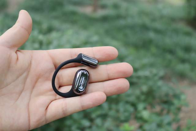 打开耳机舱取出耳机,耳机为挂耳式设计,开放式耳机主打听歌不入耳,机身整体为黑色,耳机发声单元处及耳挂最下方是黑色反光涂层,其余部分为普通黑色涂层,这样搭配起让耳机外观上美观大气,单耳重量约为7g。整体架构为记忆钛合金,结实耐用,柔韧性高,外层为亲肤硅胶材质,佩戴上采用Air-Flow贴耳科技、EEA悬停技术等,0感0压,轻巧、舒适、且稳固。