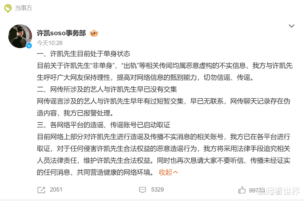 作为许凯的老板,于正对这次爆料事件反应迅速且强硬。他立即表示:“假消息,已报警”,并发表了三点声明:“许凯目前单身、聊天纪录均为伪造、各平台已蒐证”。