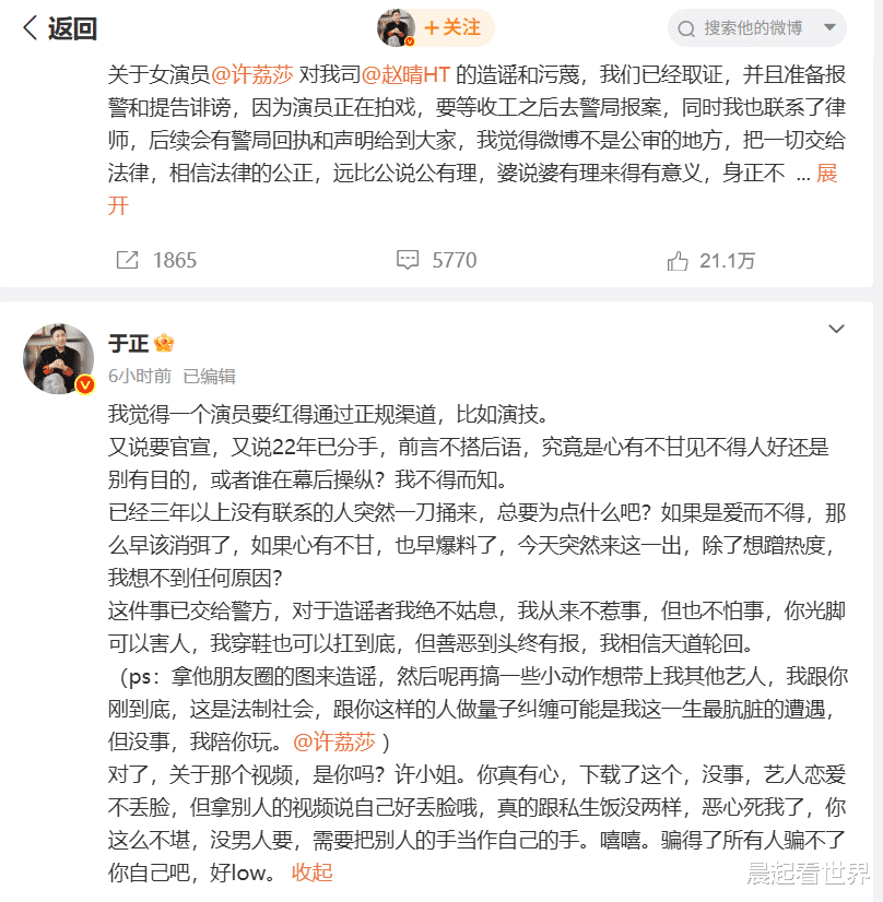 于正还在评论区回应称,许荔莎和许凯已经3年没有联系,选择在这个时候爆料是另有目的。他甚至放下狠话:“你光脚可以害人,我穿鞋也可以扛到底,现在已经报警处理。我陪你玩!”