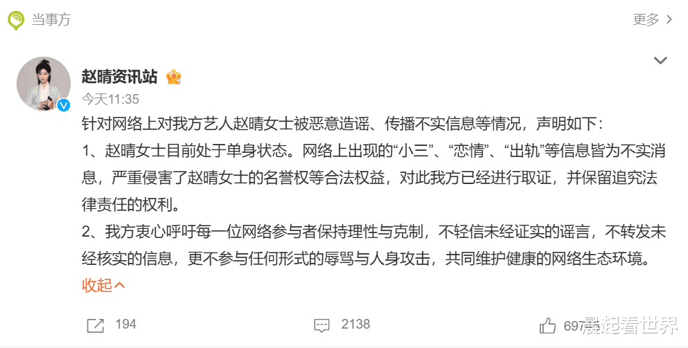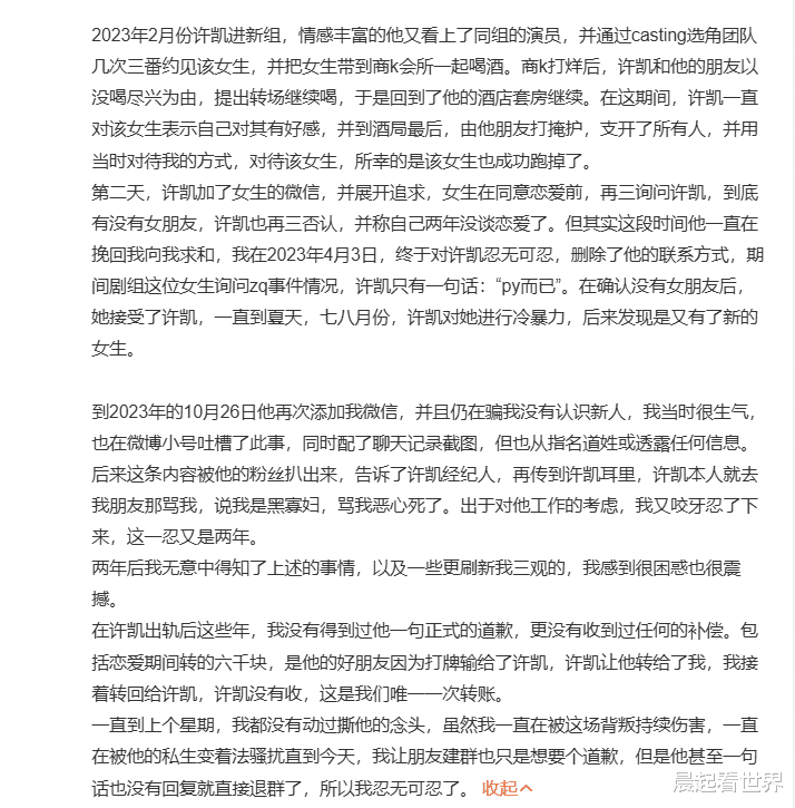 就在《子夜归》热播之际,8月21日,演员许荔莎突然发文,声称自己是许凯的前女友。她表示自己在22年底因为赵晴开房被拍而与许凯分手。