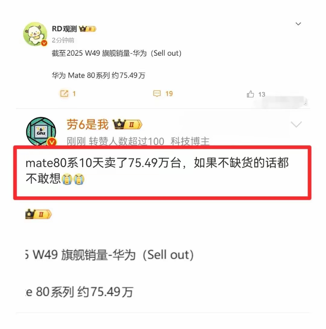 博主“RD观测”表示,华为达到这一成绩,还是在缺货的情况下。目前,Mate 80 Pro Max机型现在已经预定到两个月后了。这与此前相关人员预测的“市场饱和”、“消费疲软”等情况大相径庭,华为Mate 80系列的销量反而说明了市场的强劲需求:缺的不是钱,缺的是让人眼前一亮的好产品!