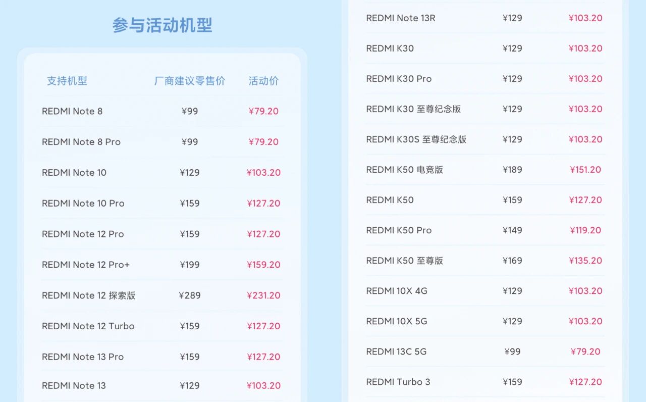 103.2 元:红米 Note 10、红米 Note 13 + Note 13R、红米 K30 + K30 Pro + K30 至尊纪念版 + K30S 至尊纪念版、红米 10X 4G、红米 10X 5G