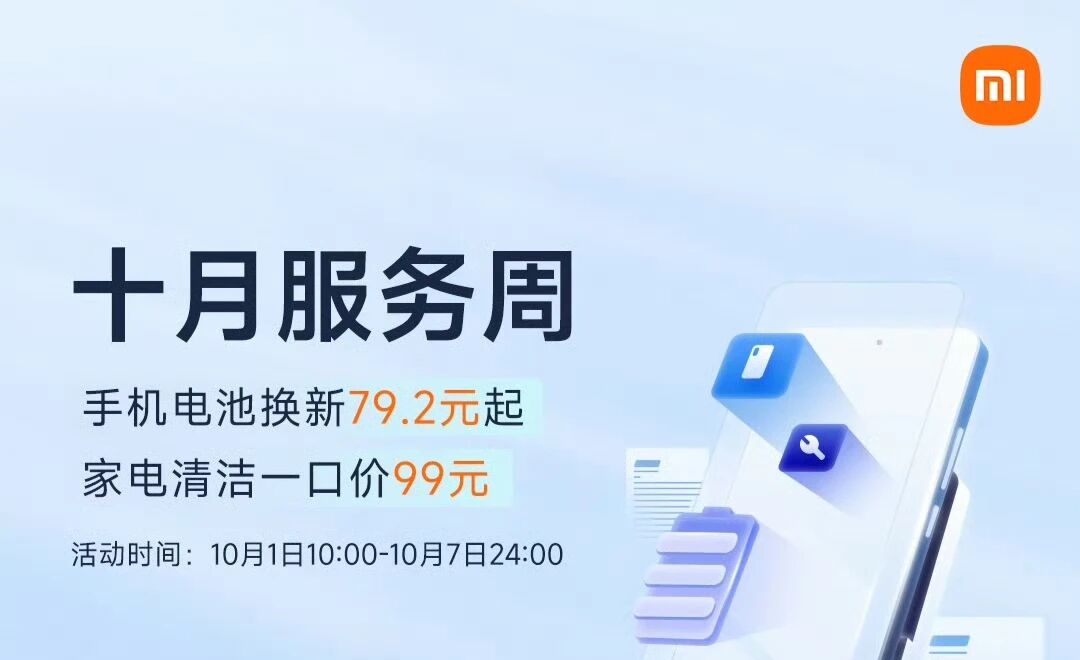 还是老样子,本期活动仍然持续一周,从 10 月 1 日上午 10 点到 10 月 7 日 24 点。活动期间,手机电池换新 79.2 元起,小米和 REDMI 笔记本深度清洁 49.5 元,家电清洁一口价 99 元。