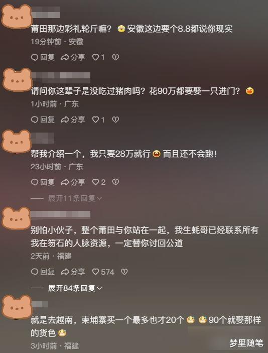 天价彩礼在莆田沿海镇特别严重,普通家庭根本负担不起。很多媒婆牵线时隐瞒女方情况,等结婚后女方就跑。这次事件后,当地开始查媒婆,但类似情况可能还不少。