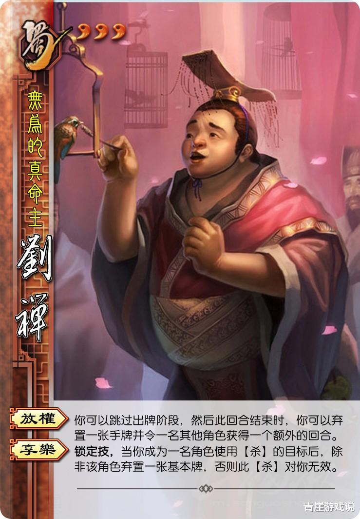 刘禅强度的大半来自于【放权】,失去自己的出牌阶段,换取其他角色的额外回合。如果队友是强力武将,那刘禅这个武将当辅助就是双倍的强力,简直是早期的概念神!
