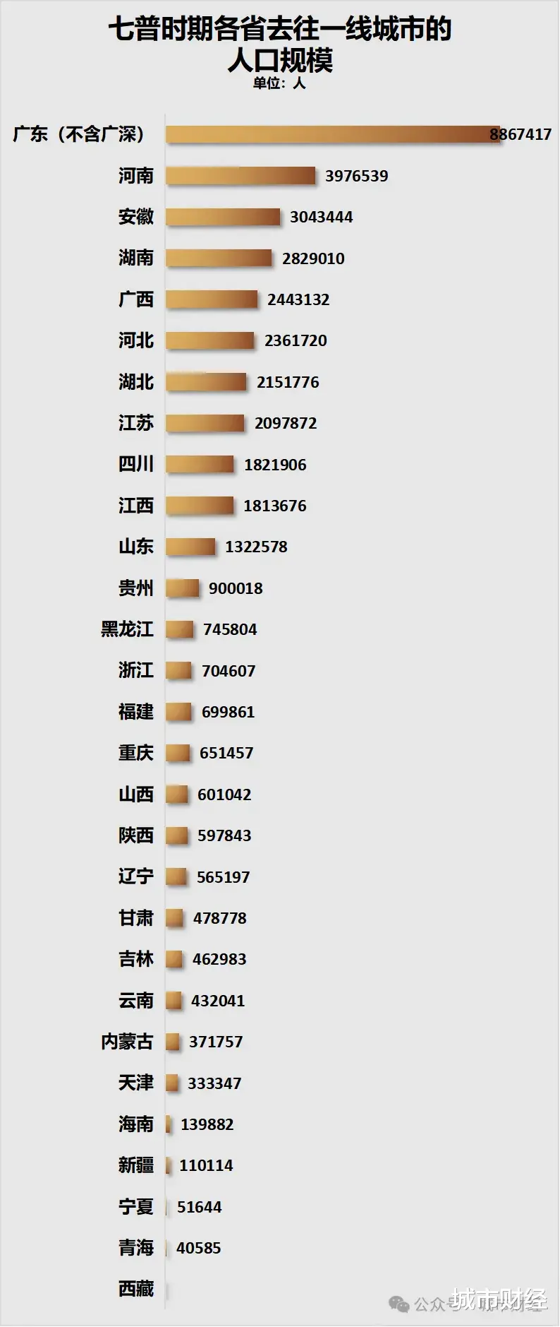 其中广东省去往一线城市的人口最多,广东省在扣除广州户籍人口、深圳户籍人口之后,广东其他19个市总共有886.74万人去了一线城市。当然广东省去的一线城市是自家的广州和深圳,广东省去往北京、上海的人口只有21万,所以绝大多数并不算外流。