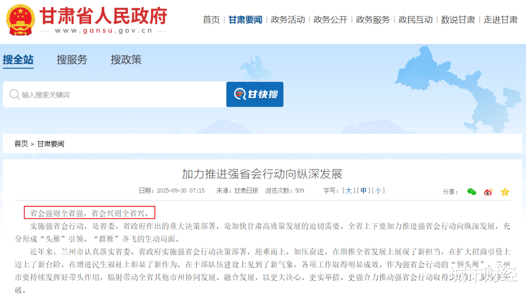 这是甘肃日报近日在报道甘肃省强省会行动推进大会时,开篇的第一句话。