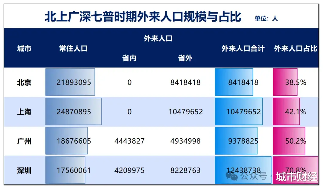 本号不久前写过一篇虹吸全国!北京、上海、广州、深圳,哪里的外地人最多?(点击标题即可查看),文章根据四大一线城市统计局公布的七普数据,梳理了一下一线城市虹吸的人口情况。