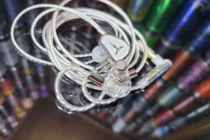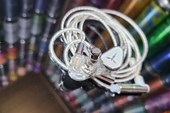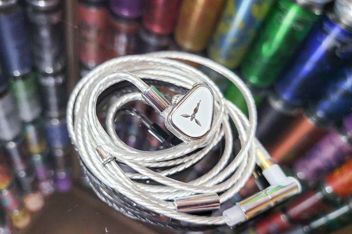 原配线材细长颜值不错,防缠绕处理的也很好,材质选择高纯铜镀厚银线芯组成,链接耳机的一端是0.78mm双针结构,另一端则是通过拔插进行不同输入规格插头的切换,可换线设计也为后期折腾提供了更多空间。外观部分,面板采用金属骨架叠加蓝宝石玻璃面盖的设计,后腔透明高透PC材质,整体简洁美观。