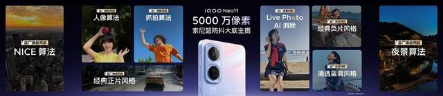 iQOO Neo11 配备后置 5000 万像素索尼超防抖大底主摄,并得到蓝厂旗舰同款 NICE 算法加持,同时影像玩法也有升级,全新的风格化光斑、负片、正片和清透蓝调等滤镜以及升级的 LivePhoto 动态照片、LivePhoto AI 消除和 AI 修图大师等,让出片更轻松。
