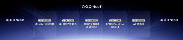 iQOO Neo11 搭载由骁龙 8 至尊版与自研电竞芯片 Q2 组成的“旗舰电竞双芯”,并在 Monster 超核引擎支撑下,带来优秀的 1% Low 帧表现、全新升级的 PC 级 2K 纹理超分、原生级 144FPS 无损超帧以及超分超帧并发,实现行业领先的游戏视效;更以 8K 冰穹 VC 液冷散热、7500mAh 超薄蓝海电池、AR 增透膜等多项 iQOO 15 同款配置、高质感金属玻璃机身和 IP68 & IP69 防尘防水等,共筑一款更优秀的强悍标准版。