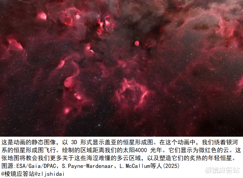这几天欧洲航天局的盖亚(Gaia)空间望远镜数据被圣安德鲁斯大学LewisMcCallum团队利用,首次绘制出覆盖4,000光年范围内的银河系恒星形成区域三维地图,囊括了4,400万颗恒星。