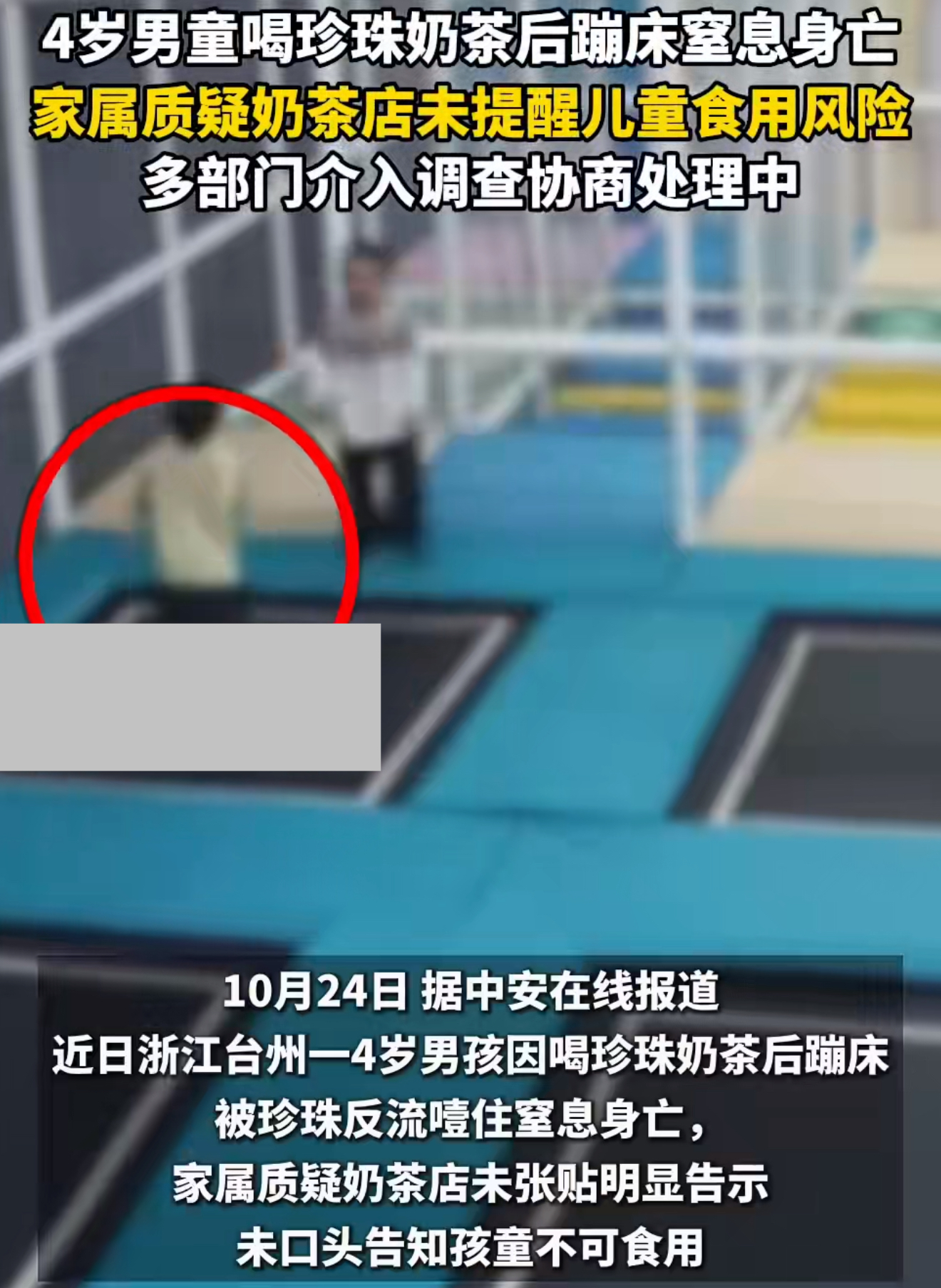 那天,小男孩喝下珍珠奶茶后,在蹦床上尽情跳跃,享受着童年的快乐。可谁能想到,悲剧就在这时悄然降临。珍珠反流,瞬间卡住了他的喉咙,小小的他无力挣扎,最终因窒息离开了这个世界。一条鲜活的生命,就这样消逝了,留给家人的,是无尽的悲痛和难以抚平的伤痕。