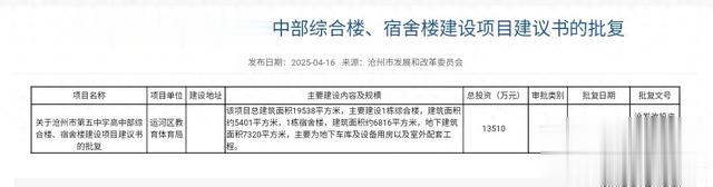 4月16日,沧州市发改委官网发布了有关沧州市第五中学的相关项目建设的批复,原文如下