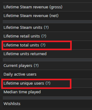 如果你已经发布了一款游戏,你可以查看Steamworks财务数据,了解游戏的终生总销量(包括Steam销量和关键激活量),并将其与实际启动游戏的终生用户数进行比较。