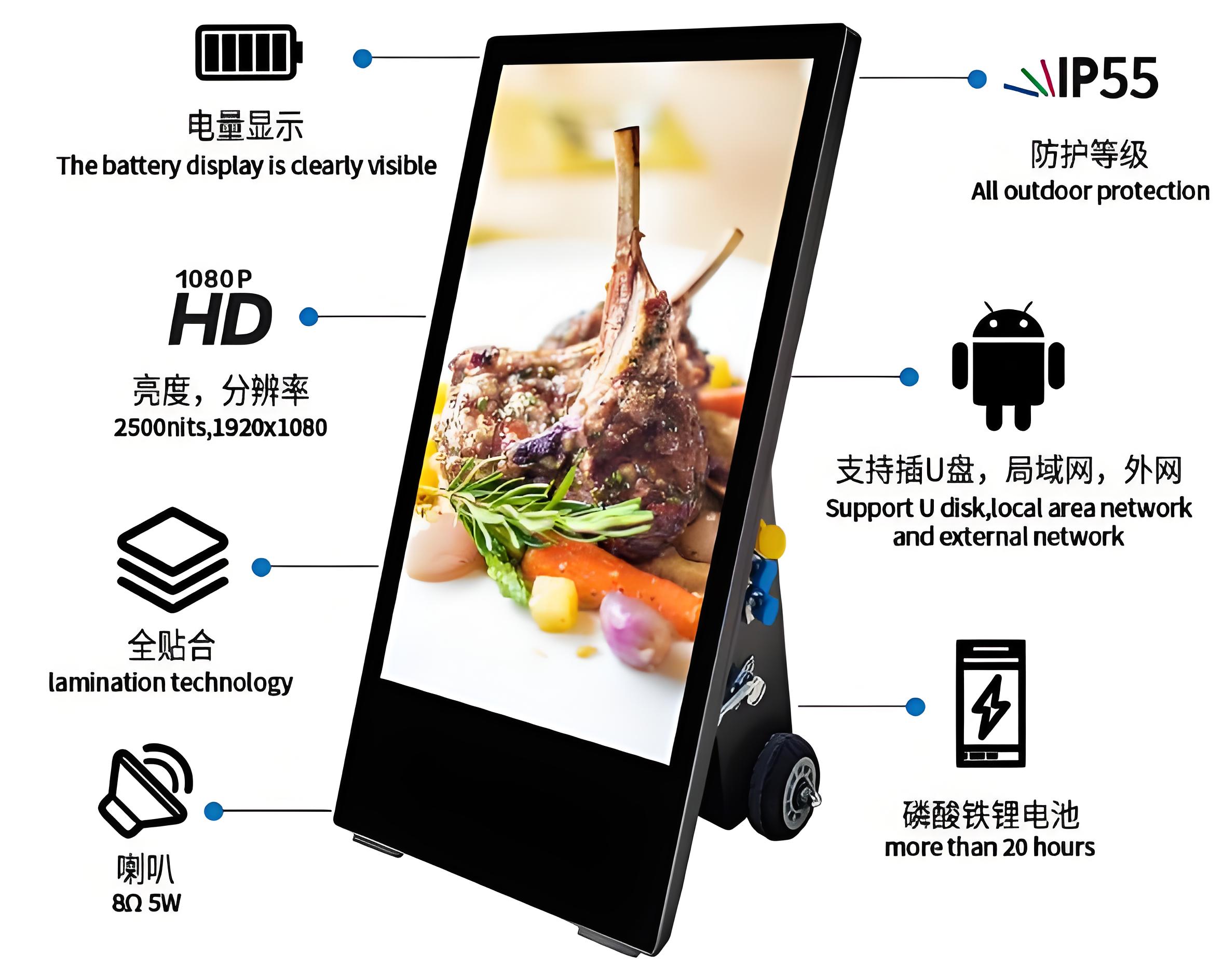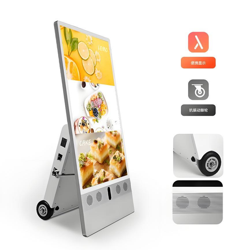 移动电子水牌最大的亮点就在于“可移动、可户外使用”。尺寸多样,常见的尺寸包括32寸、43寸、49寸等,配备移动滑轮、便携支架。能够轻松在展会、促销活动、户外市集等场景自由转移,不用插电,充一次电可使用5-7小时,打破传统广告牌固定位置的限制。