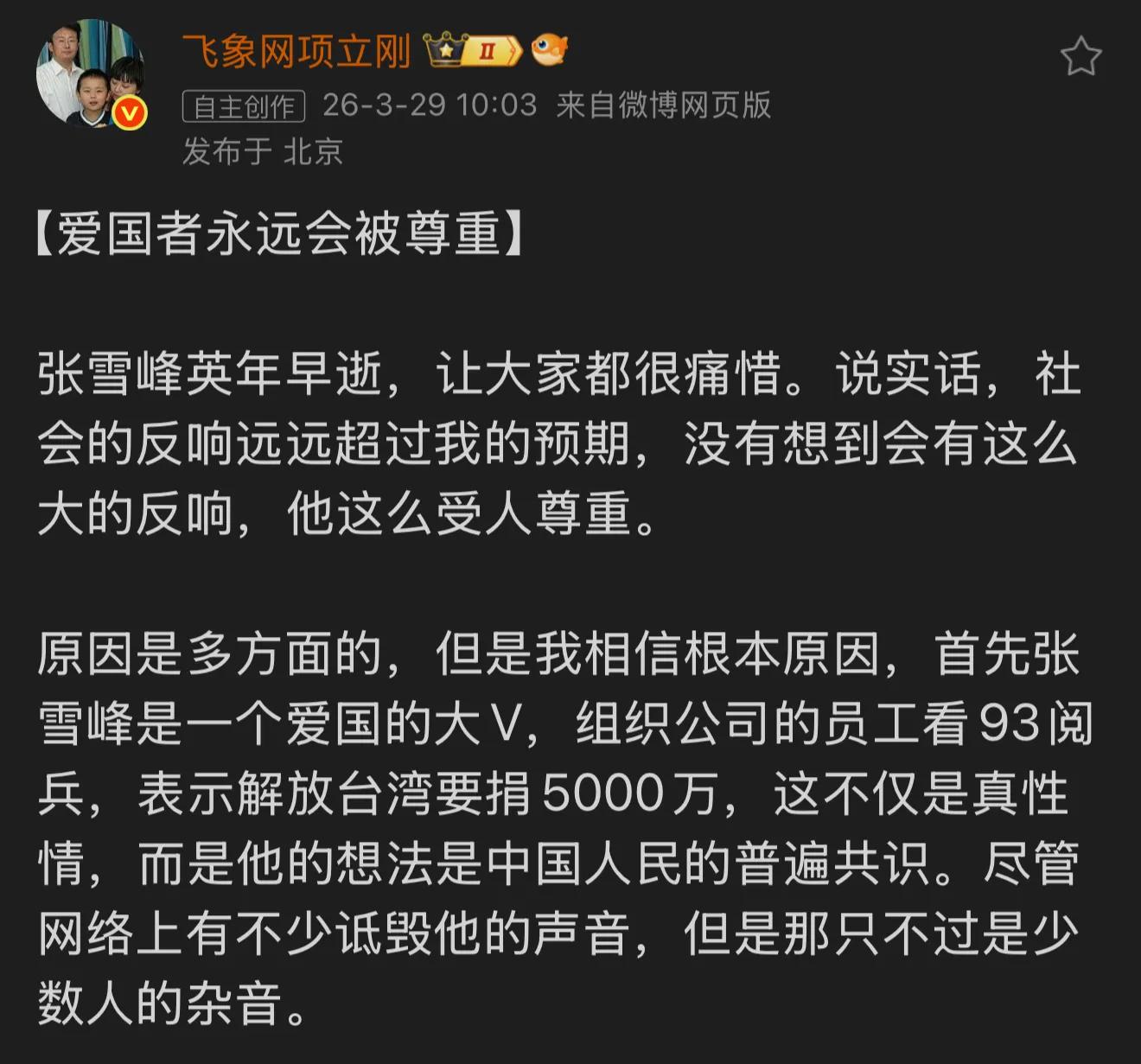 张雪峰走了,3月29日,飞象网大V项立刚的一篇博文,像一把锋利的刀,精准地剖开了公众积压已久的情绪。