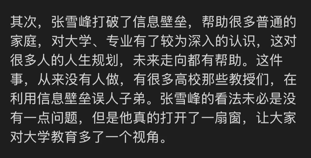 紧接着,项立刚点出了张雪峰的第二个,也是更接地气的功绩:他“打破了信息壁垒”。