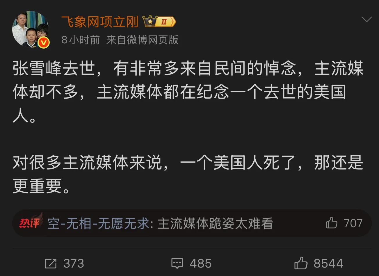 项立刚还说,张雪峰去世,主流媒体发个讣告都是恩赐,一个美国人李昌钰死了,主流媒体铺天盖地报道,他为张雪峰几分打抱不平。