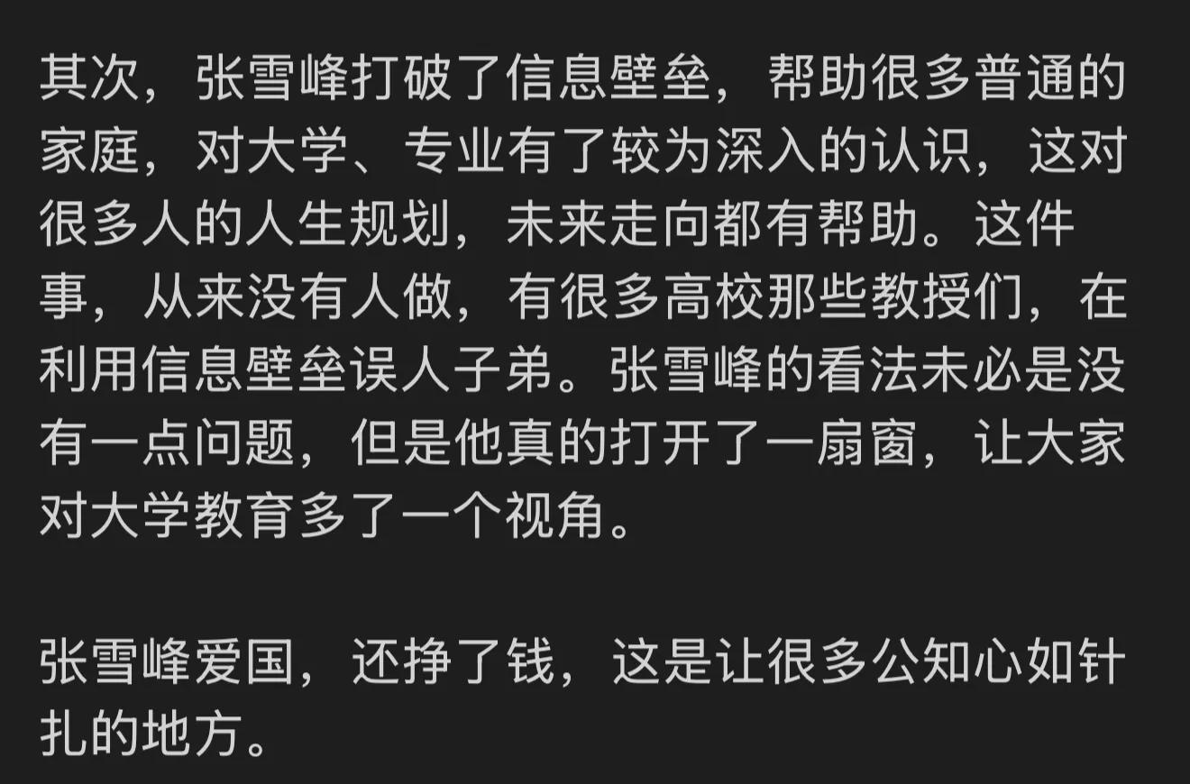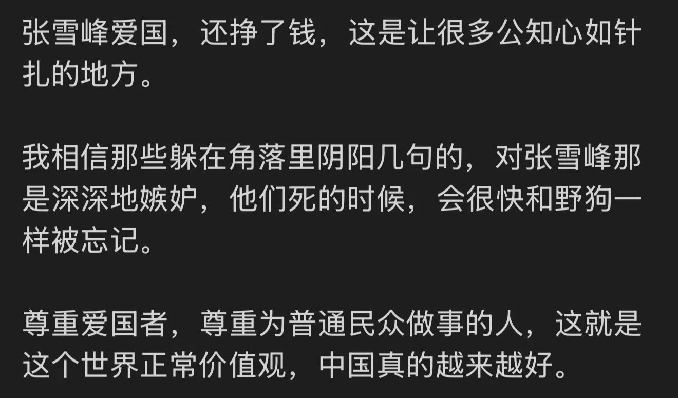 他写道:“张雪峰爱国,还挣了钱,这是让很多公知心如针扎的地方。” 这句话,彻底将张雪峰的商业成功,赋予了道德正当性。它暗含了一个尖锐的对比:那些整天批判的“公知”们,是否在爱国与赚钱之间做到了统一?