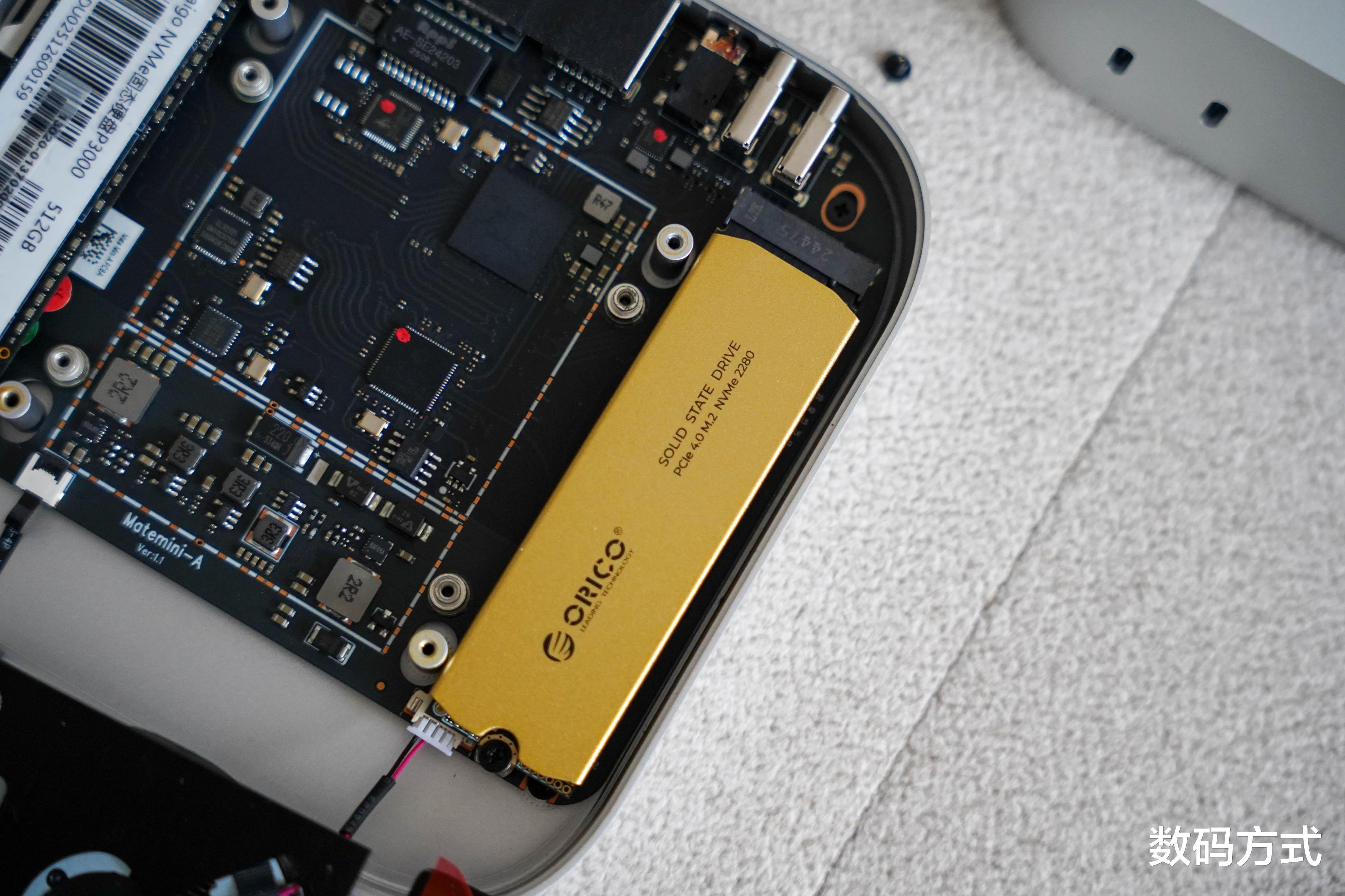 好了,话不多说直接上机测试,我这里选用的拓展坞是支持雷电4、雷电5的零刻Mate mini,目的嘛也很简单就是为了满血发挥这块硬盘在Mac mini M4身上的性能。拧开螺丝,插上固态,但是这里别忘了贴硅胶散热片和铜片可以更好的帮助固态进行散热,可以保证在固态高速读写是依旧有很好的稳定性。