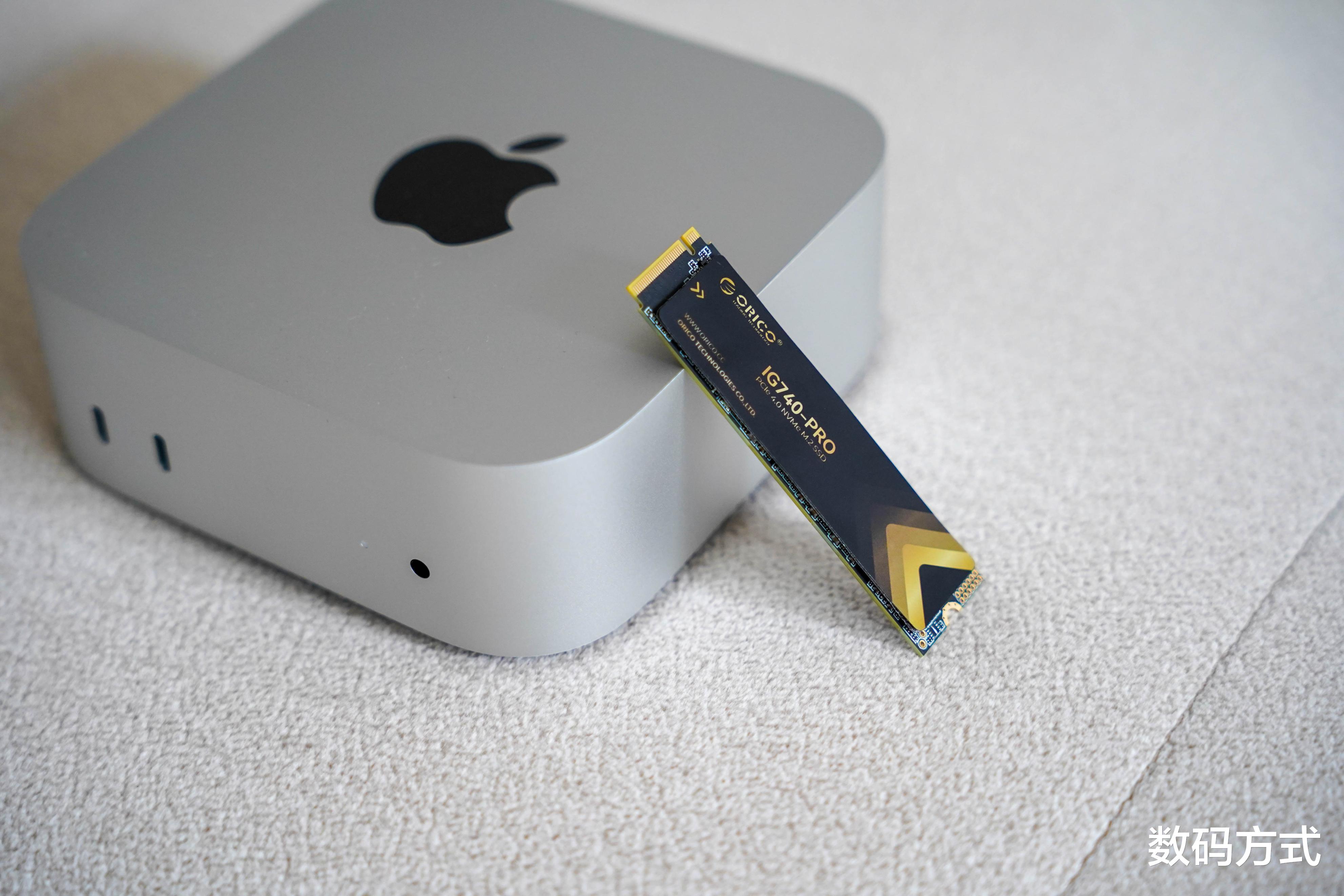 为什么选择奥睿科IG740 Pro这块固态硬盘来作为拓展盘呢?其实原因非常简单,简单总结就是性能强、价格便宜、性价比高。这块固态硬盘采用长江存储颗粒+联芸1602主控的组合方案,其中颗粒技术采用长江晶栈Xtacking 3.0架构,单颗闪存颗粒的原生工作速度2400MT/s,另外还采用了全新的 NVME 2.0协议,理论速率读取可以达到7400MB/s,可以说用来升级Mac mini M4甚至有点大材小用,不过可以怒省两千多块以及满血运行这么一对比可以说性价比十足了。