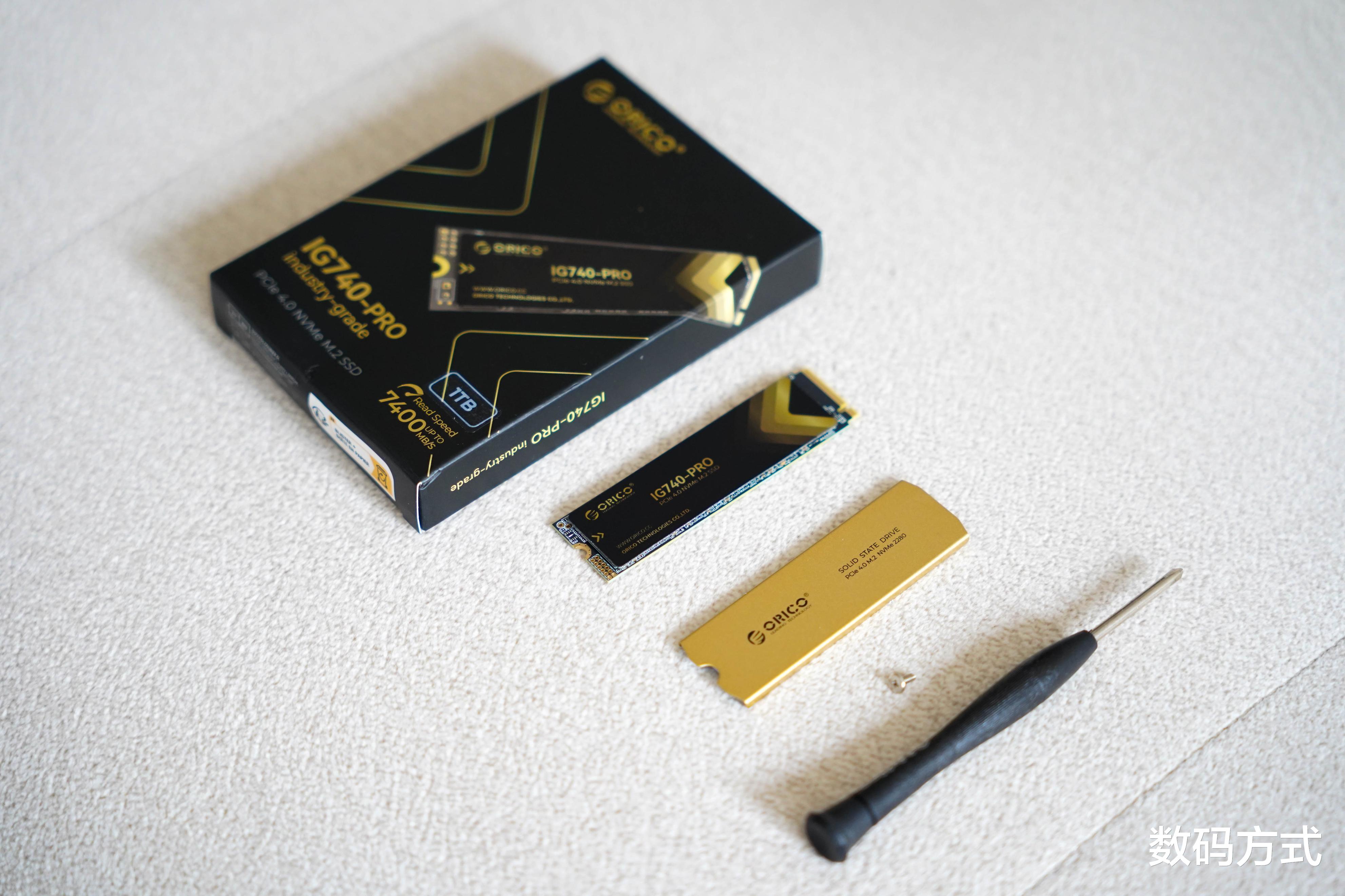 包装方面,奥睿科IG740 Pro包装盒采用的是科技感很强的黑金配色,7400MB/s的高速读取这时候看起来很显眼啊,不过有一说一这次附赠的配件确实很丰富,为了更好的散热稳定发挥直接给了金属材质散热马甲、散热硅胶片,甚至贴心的给了螺丝刀以及十字螺丝,这不就是妥妥奔着给电脑扩容的需求来的。所以啊这里如果你是win用户,同样可以选择这块硬盘来进行扩容,PCIe 4.0通道8GB/s通道完全可以跑满,性价比会再拔高一些。