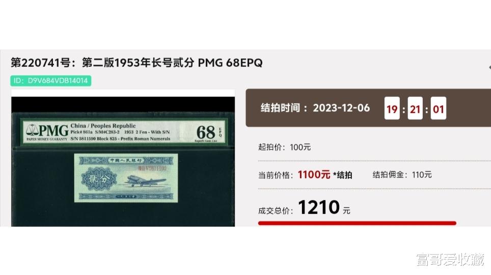 在2023年12月6日的“春秋大拍”中,一张PMG评级68分的(长号码版)“贰分纸币”,就拍出了1210元。