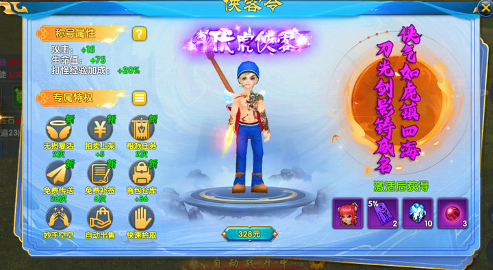 侠客令特权:有条件的话,可以激活侠客令特权。特权中包含的随身商店、随身仓库、自动出售、自动买药等功能,可以大大提升游戏体验和效率。