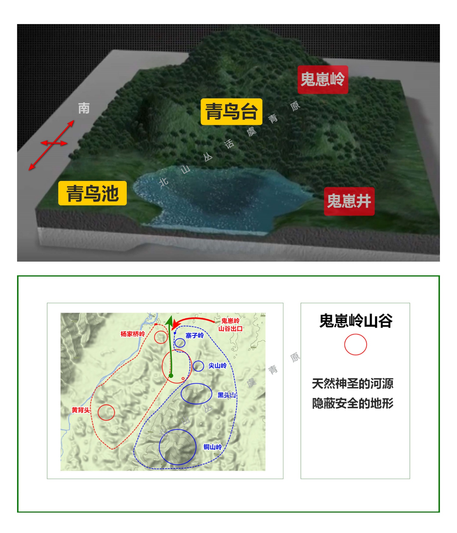 鬼崽岭是三青鸟驮载的祭祀之台,祭祀对象是西王母。在遥远的过去,鬼崽岭山谷里矗立着祭祀的木制高台。鬼崽岭可称作“青鸟台”,鬼崽井可称作“青鸟池”。