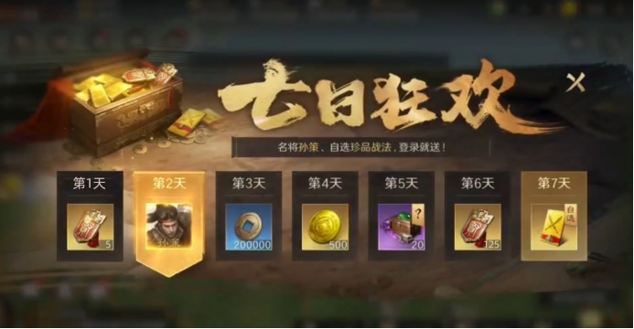 接着就是七日狂欢活动,第二天就送橙将孙策。孙策那可是骁勇善战的猛将,有了他,攻城略地不在话下。后续活动还会赠送自选战法包等高价值道具,战法在游戏中可是能大幅提升武将和队伍实力的关键,自选战法包能让大家根据自己的阵容需求来选择最合适的战法,大大增强了队伍的战斗力。不少玩家都表示,七日狂欢活动让他们快速组建起了一支有战斗力的队伍。