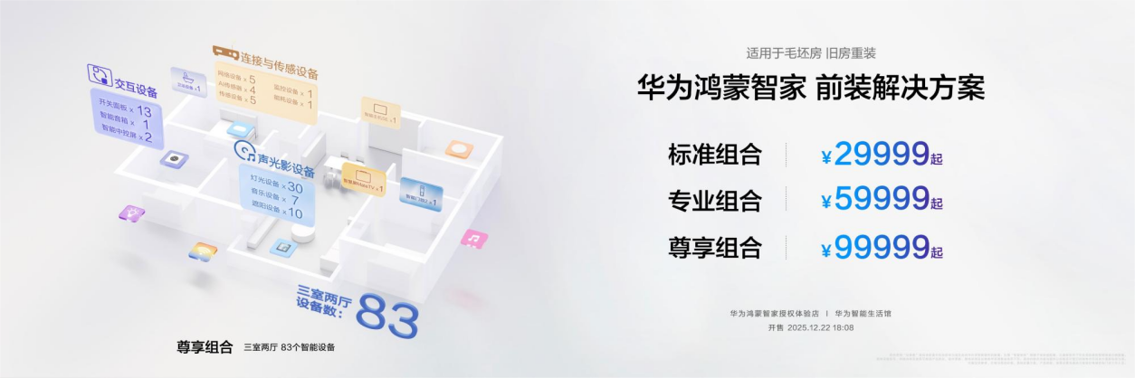而针对3室2厅约90平米户型,华为鸿蒙智家推出的覆盖前装与后装场景的各三档智装套餐,则提供了清晰、灵活的选择路径。其中,前装解决方案,涵盖标准组合(29999元)、专业组合(59999元)和尊享组合(99999元),满足不同预算人群的品质家装需求;后装解决方案,涵盖尝鲜组合(9999元)、标准组合(25999元)、专业组合(49999元),为已完成装修的用户提供智能化升级选择。特别是后装解决方案,以“不破墙、免布线、最快24小时完工”等优势,极大降低了智慧生活改造的门槛,让已装修家庭也能轻松拥抱智能化。