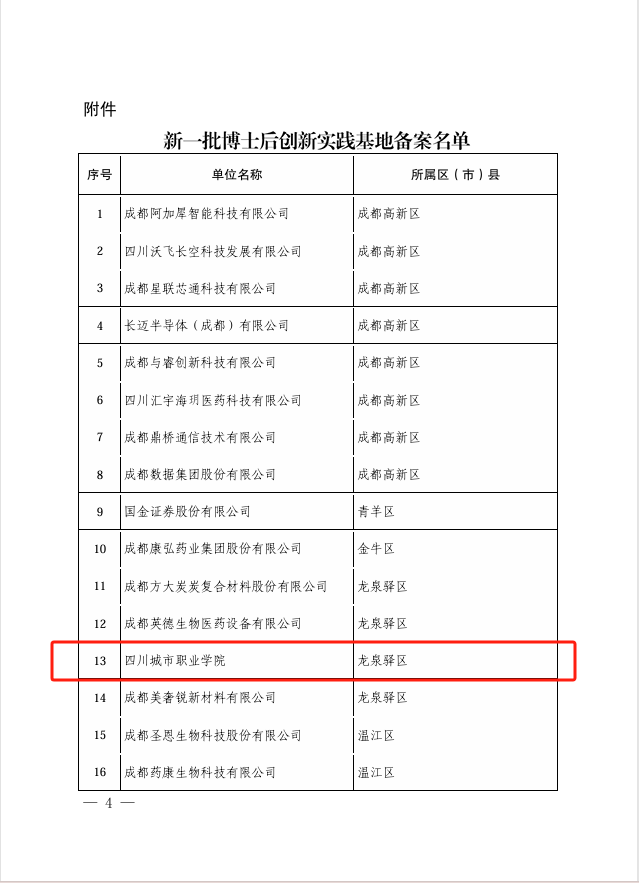 在本次获批设立博士后创新实践基地的22家单位中,四川城市职业学院是唯一入选的职业院校,彰显了学校在应用型科研与产教融合方面的突出地位。