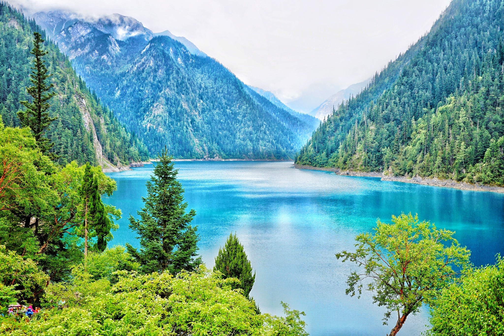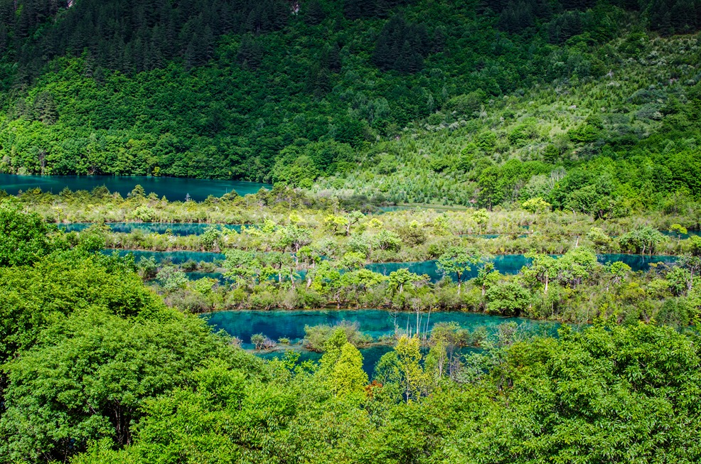 五花海被誉为"九寨精华"。湖水清澈见底,由于湖底沉积物的分布差异,水面呈现出宝蓝、翠绿、橙黄等色彩,犹如一块巨大的调色板,在阳光下熠熠生辉。