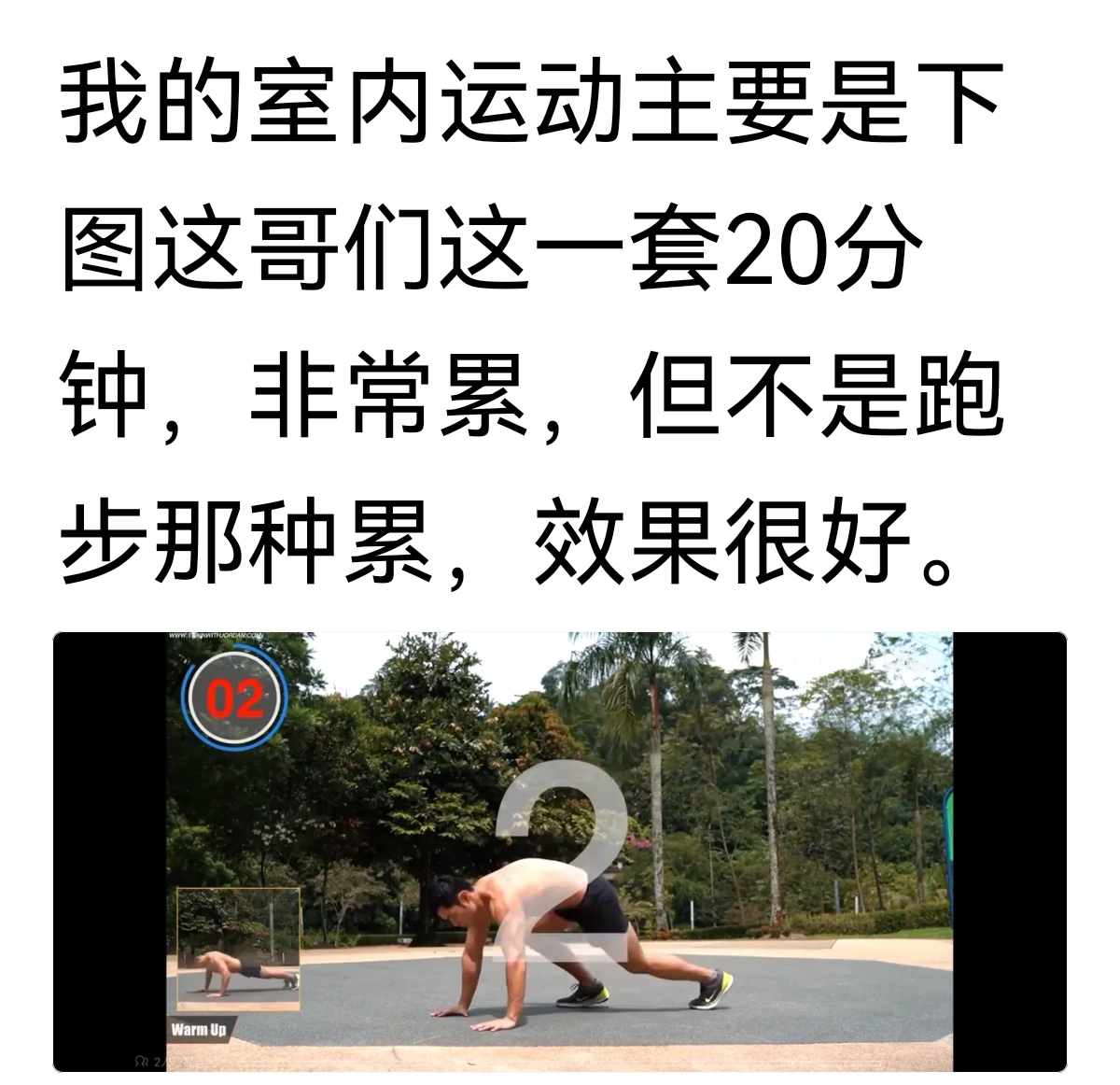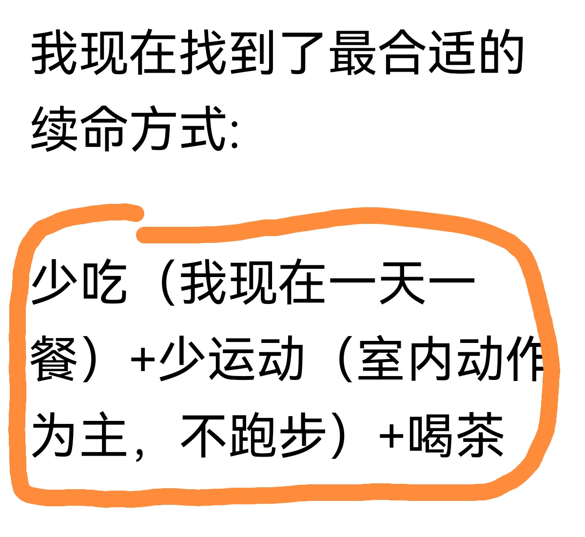 他说10年前每年跑一千公里,后来不跑了。续命的方法是“少吃(一天一餐)+少运动(室内动作为主,不跑步)+喝茶”,现在身体很好。他还晒出了一个人室内20分钟的运动方式。
