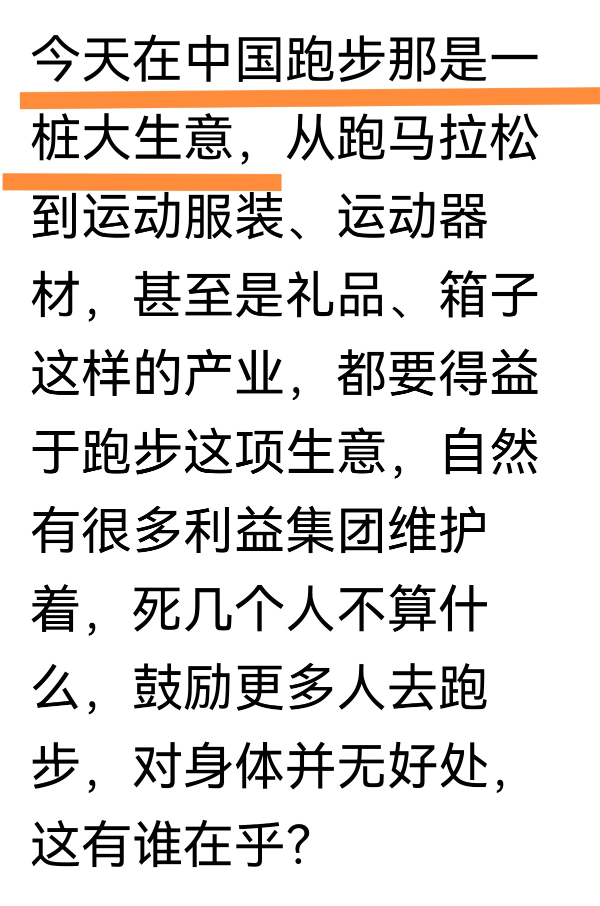 项总显然不赞成普通人去高强度的跑步运动。马拉松等做成了产业,为了逐利而引人入身的观点,值得“当局者”思考。
