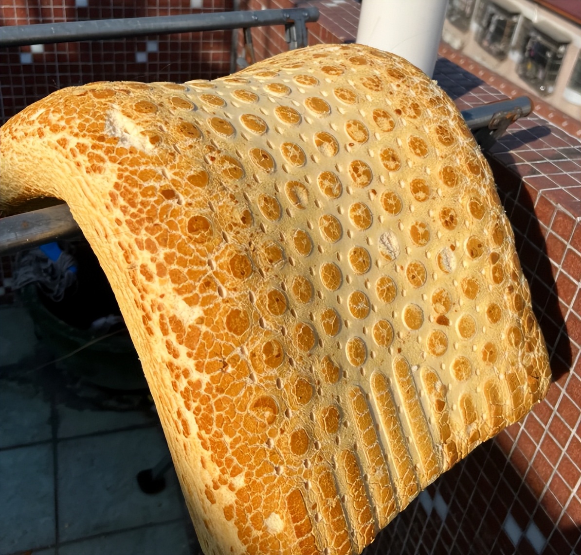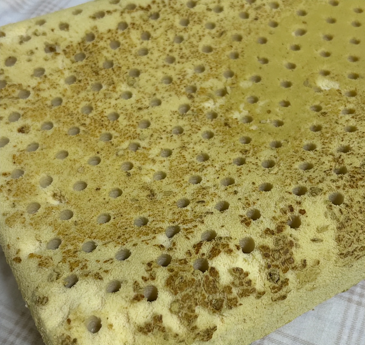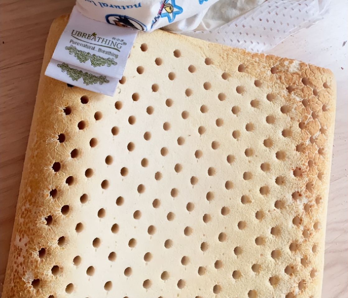 大家自查一下看看,若发现乳胶枕已经发黄严重,或者已经粉化了就直接扔掉,真不要舍不得,尤其是劣质的乳胶枕,长期用还会释放出有害物质。