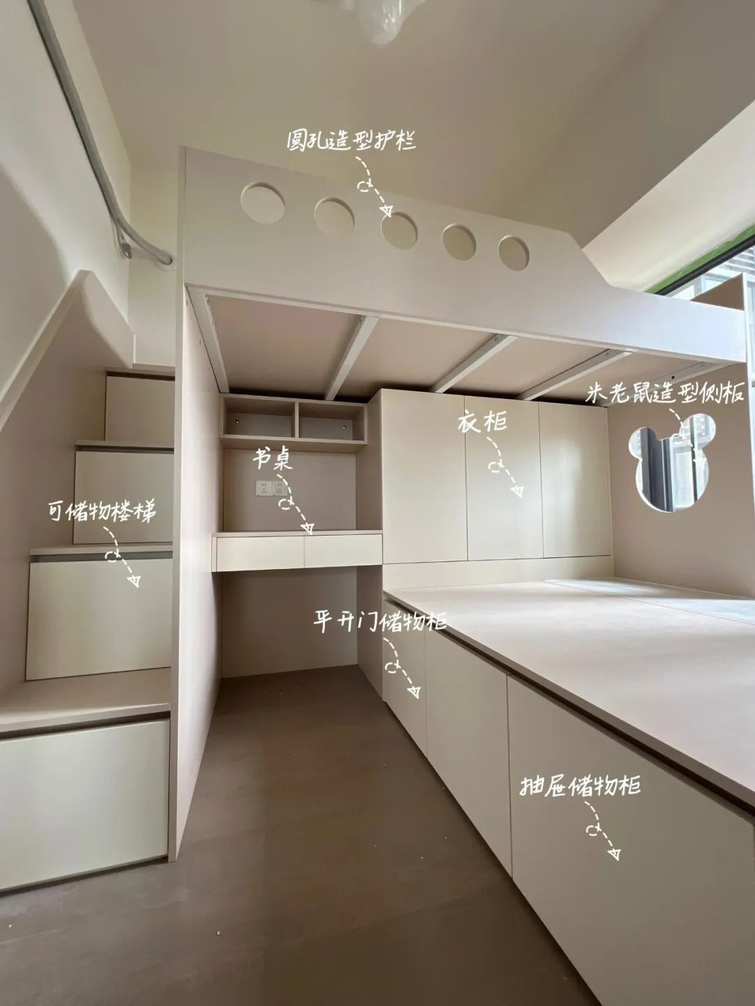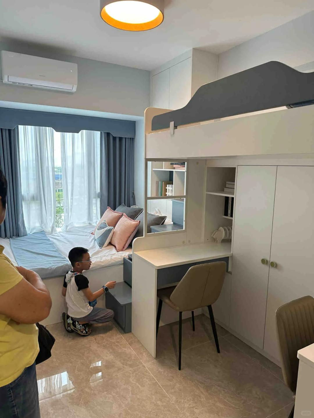 最惊艳的是空间利用率。我家儿童房才 8 平米,摆完错位床,下铺侧面塞得进孩子的绘本架,上铺楼梯做成抽屉,能装下所有乐高零件。两个孩子一个在上铺,一个在下铺,各有各的小天地,再也不用为抢地盘吵架了。