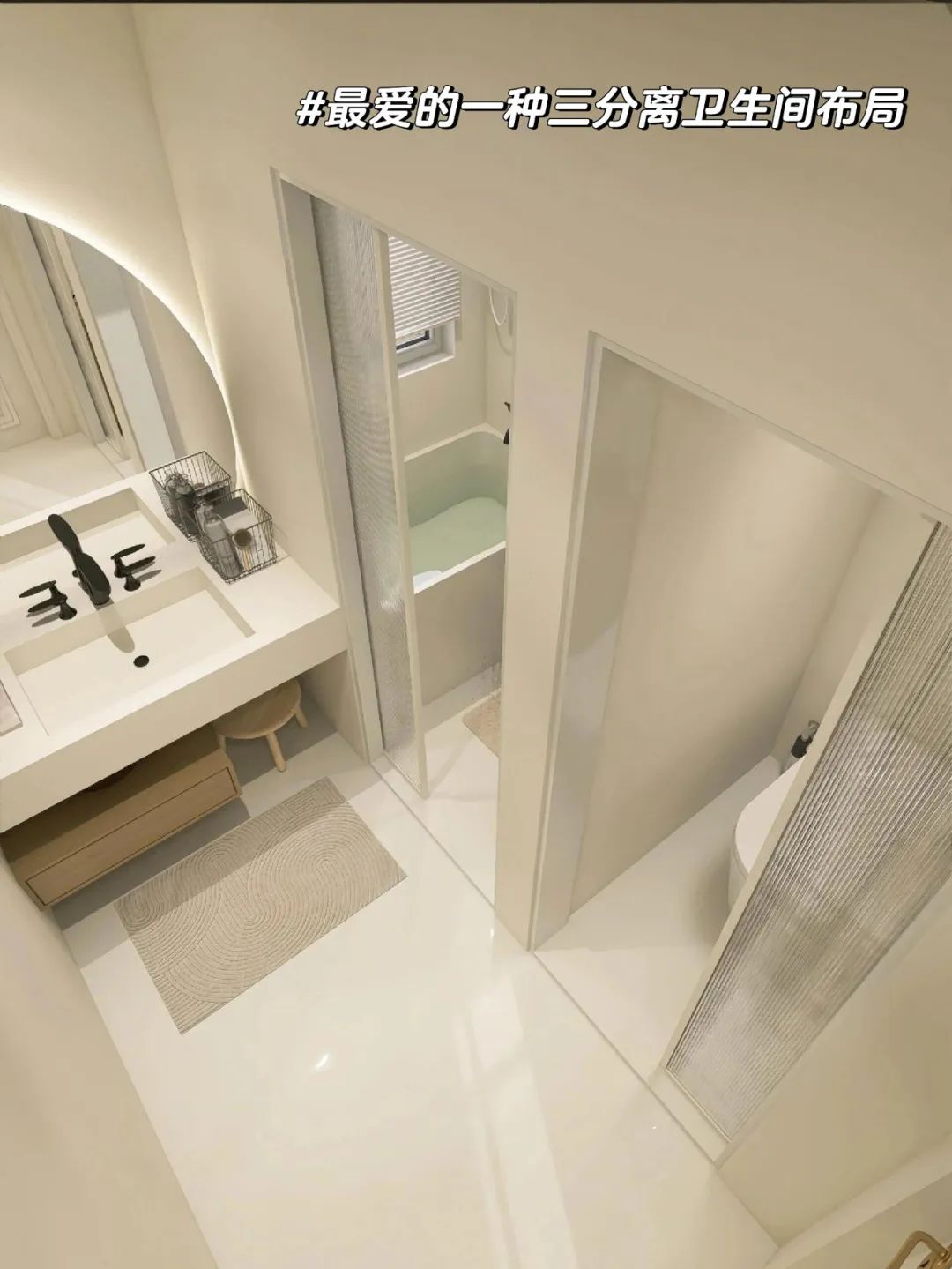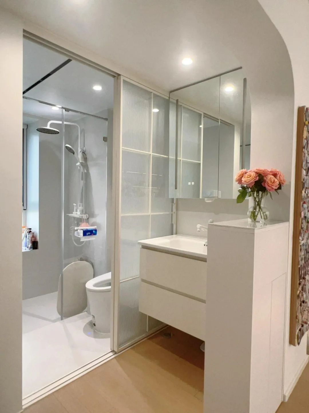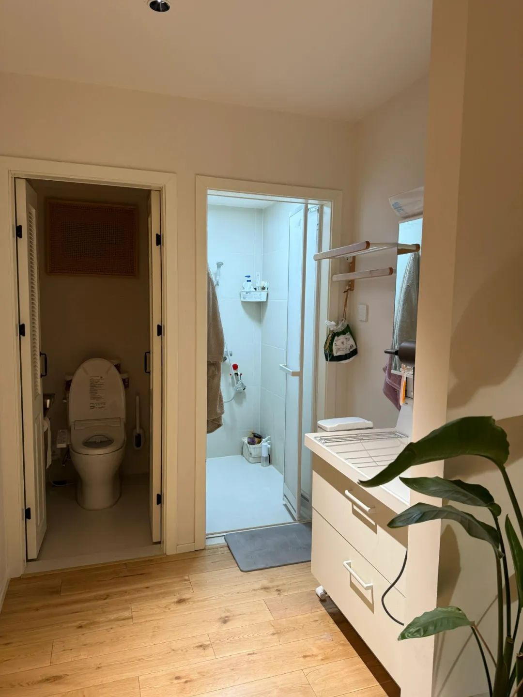 有人担心空间小做不了,其实,我家卫生间才 3 平米,把洗手台挪到了门外,照样实现了三分离。