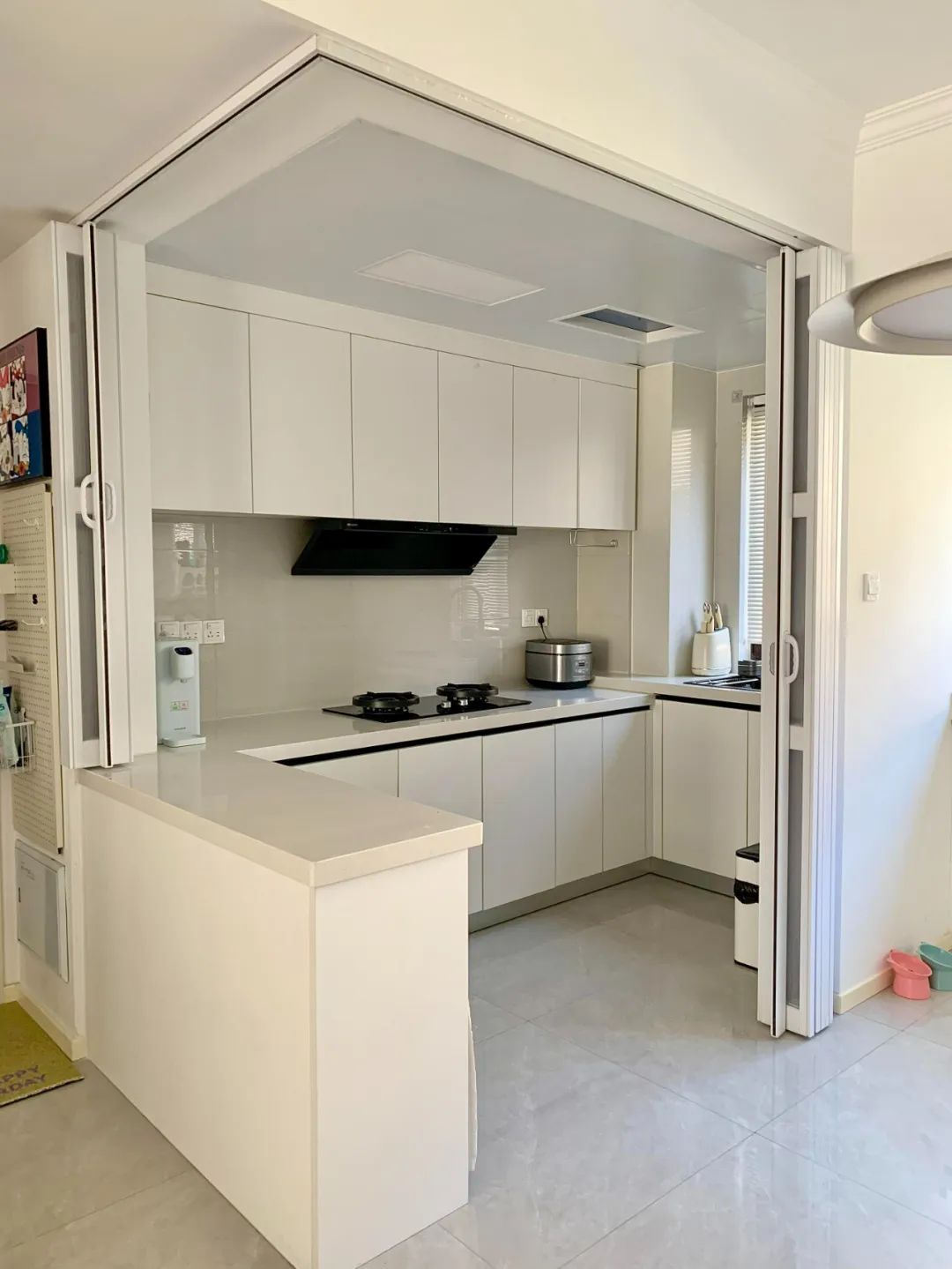 想封闭时,把 PD 门一推,两面玻璃墙严严实实,炒菜油烟跑不出去,燃气检查也能顺利通过。想敞开时,将门完全推开藏到墙后,两面墙瞬间“消失”,厨房和客餐厅连成一体,采光一下子亮堂好几倍,空间也显得宽敞不少。