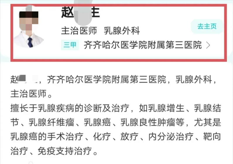 通过网上的公开信息可查,齐市附属三院的乳外科,确实有这么一个,叫赵X生的副主任。