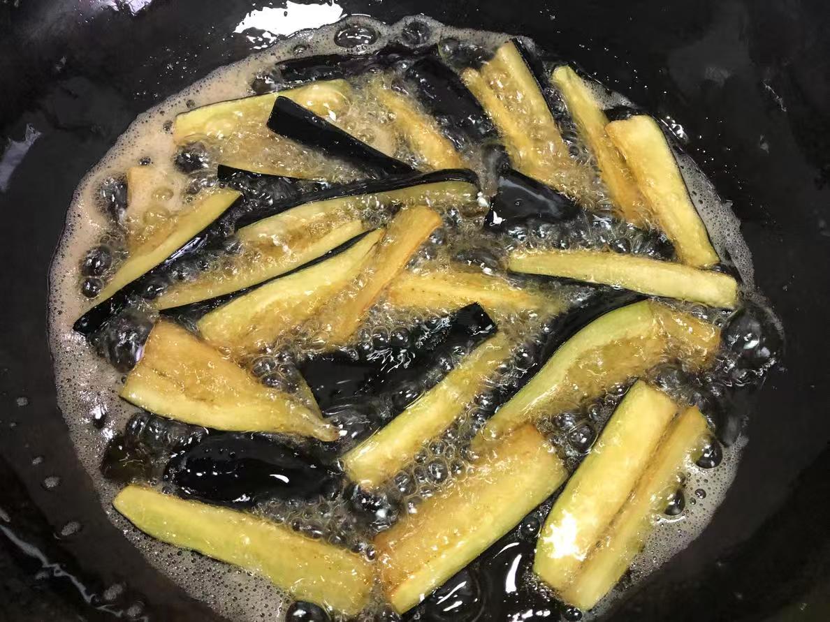 - 锅中倒入适量的油,油温烧至六成热(约150℃),即筷子插入油中周围有小气泡冒出时,将浸泡好的茄子条沥干水分,逐条放入油锅中炸制。