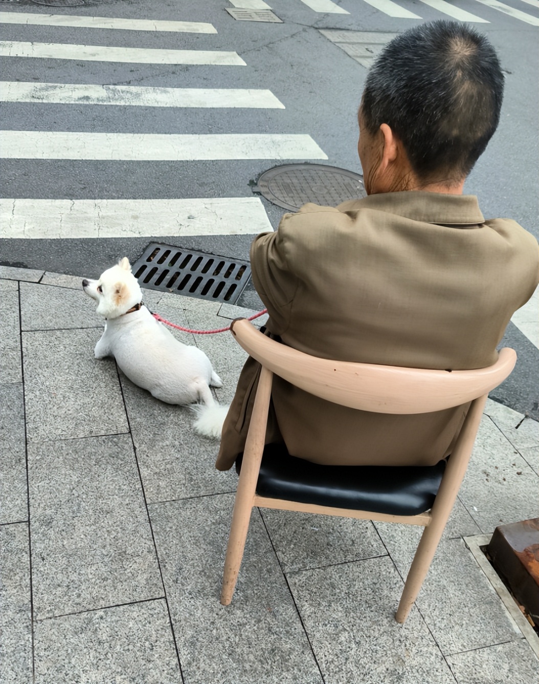 路过小街的十字路口,每每会有老人独坐,身边陪着小狗。这些狗不跑不叫,就那么静静地和主人保持相同姿态,相互陪伴。
