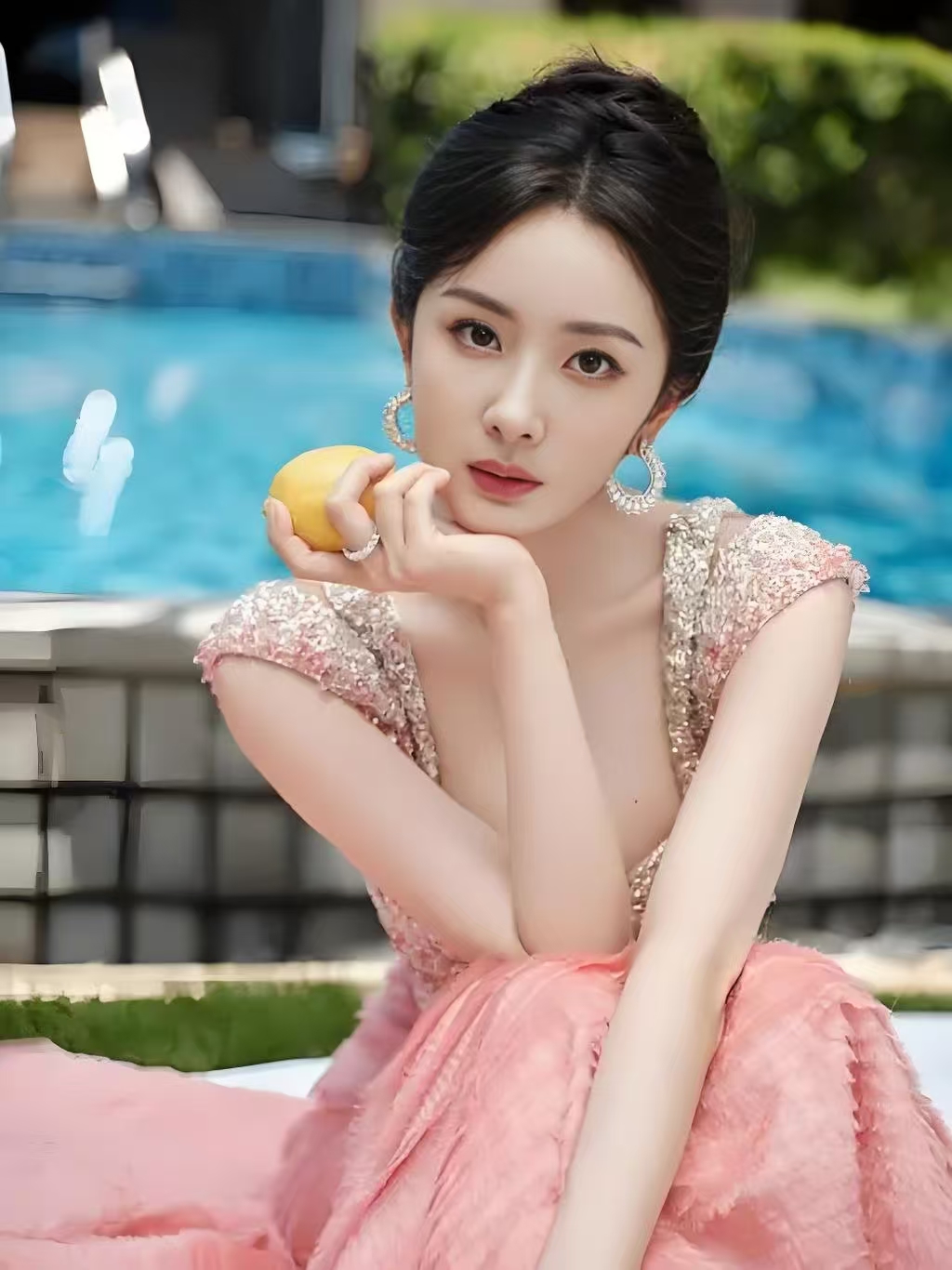 杨幂身穿 tonyward2024 秋冬定制的粉色亮钻鱼尾裙,完美勾勒出她纤细的腰身和修长的双腿,裙子上的亮钻在阳光下闪闪发光,美不胜收。她选择了高贵优雅的盘发,露出光洁的额头和修长的颈部,突出了精致的五官,让整个造型显得清新脱俗。