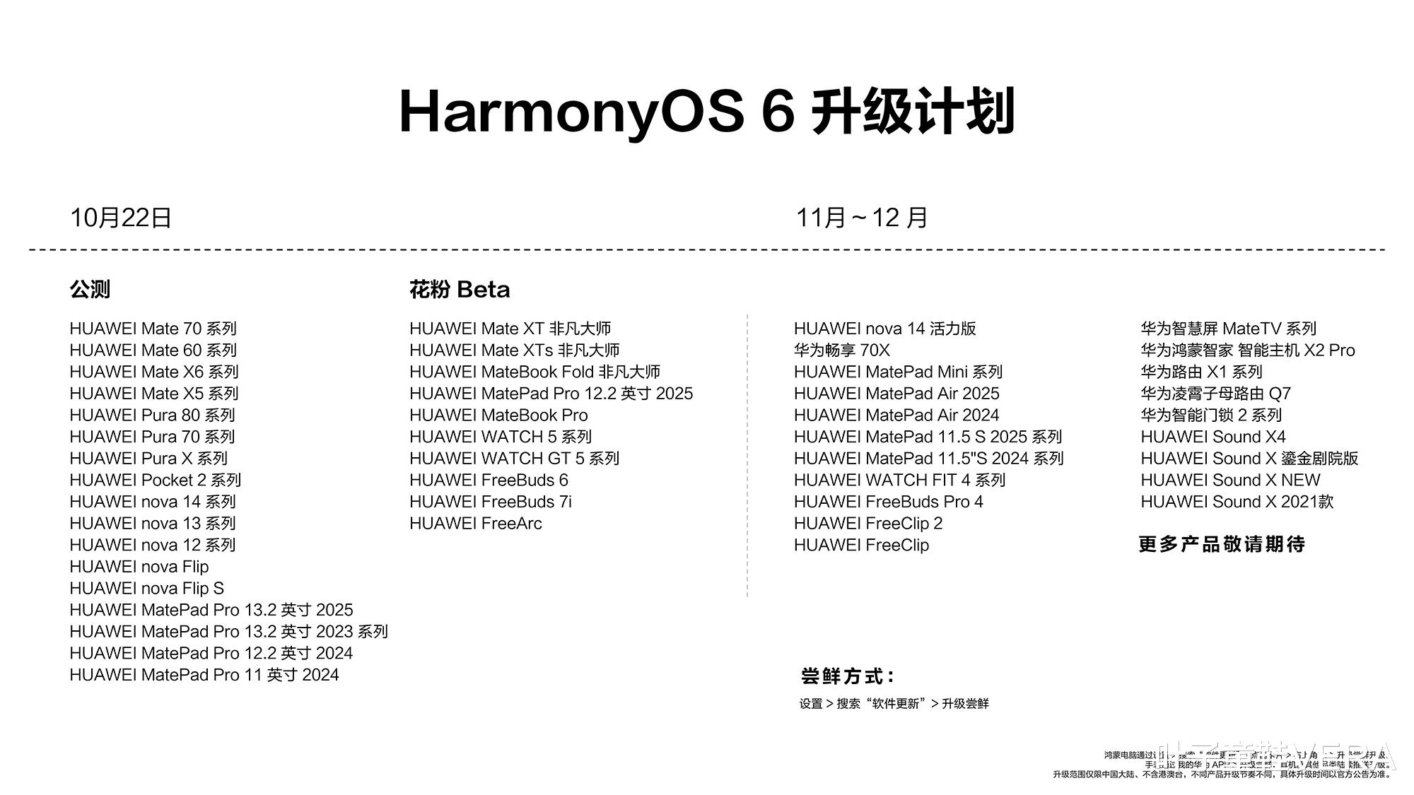 10月22日起,HarmonyOS 6面向首批90多款机型陆续开放升级。用户可在系统设置软件更新和“我的华为”App首页申请升级尝鲜,加入公测,抢先体验新一代鸿蒙操作系统的强大魅力!